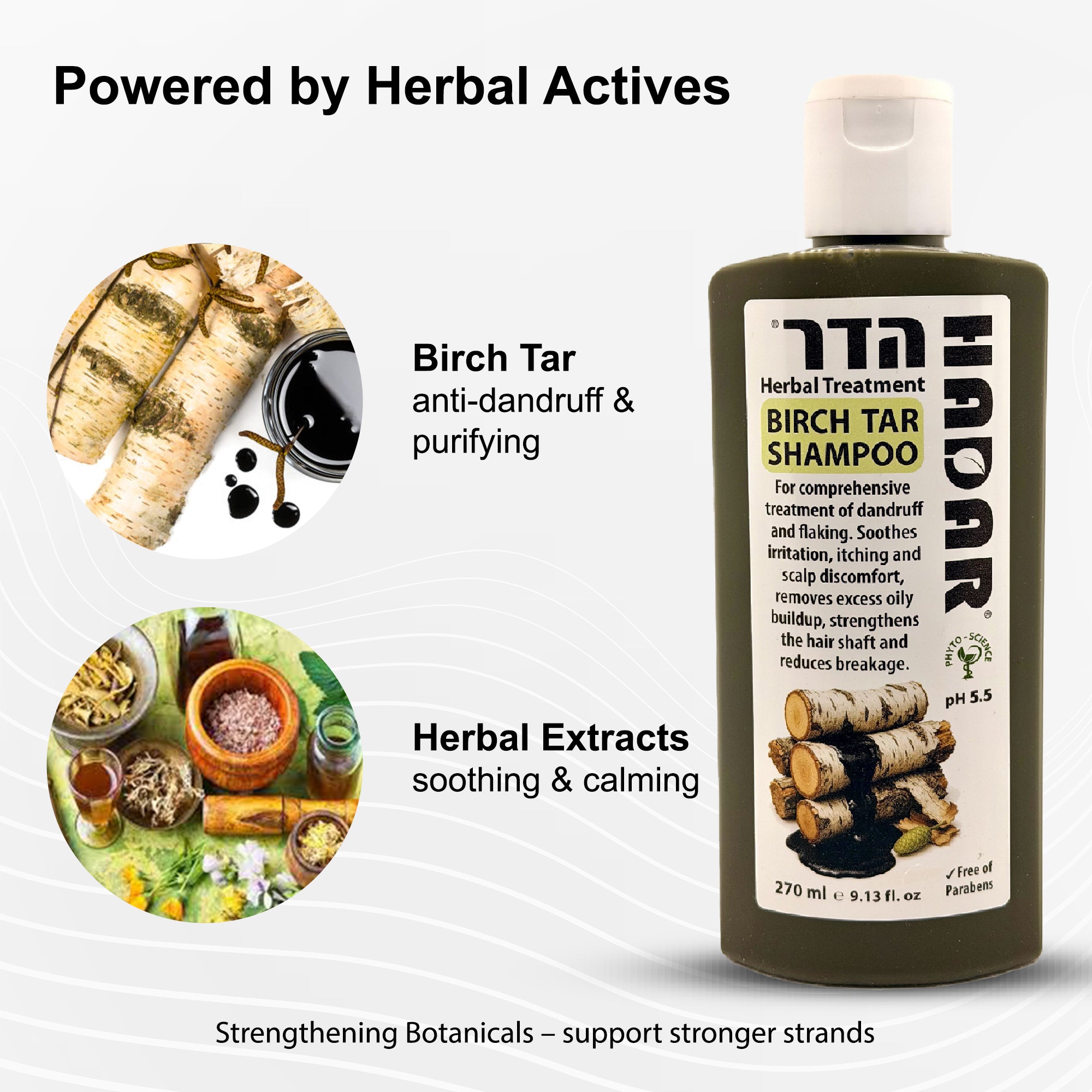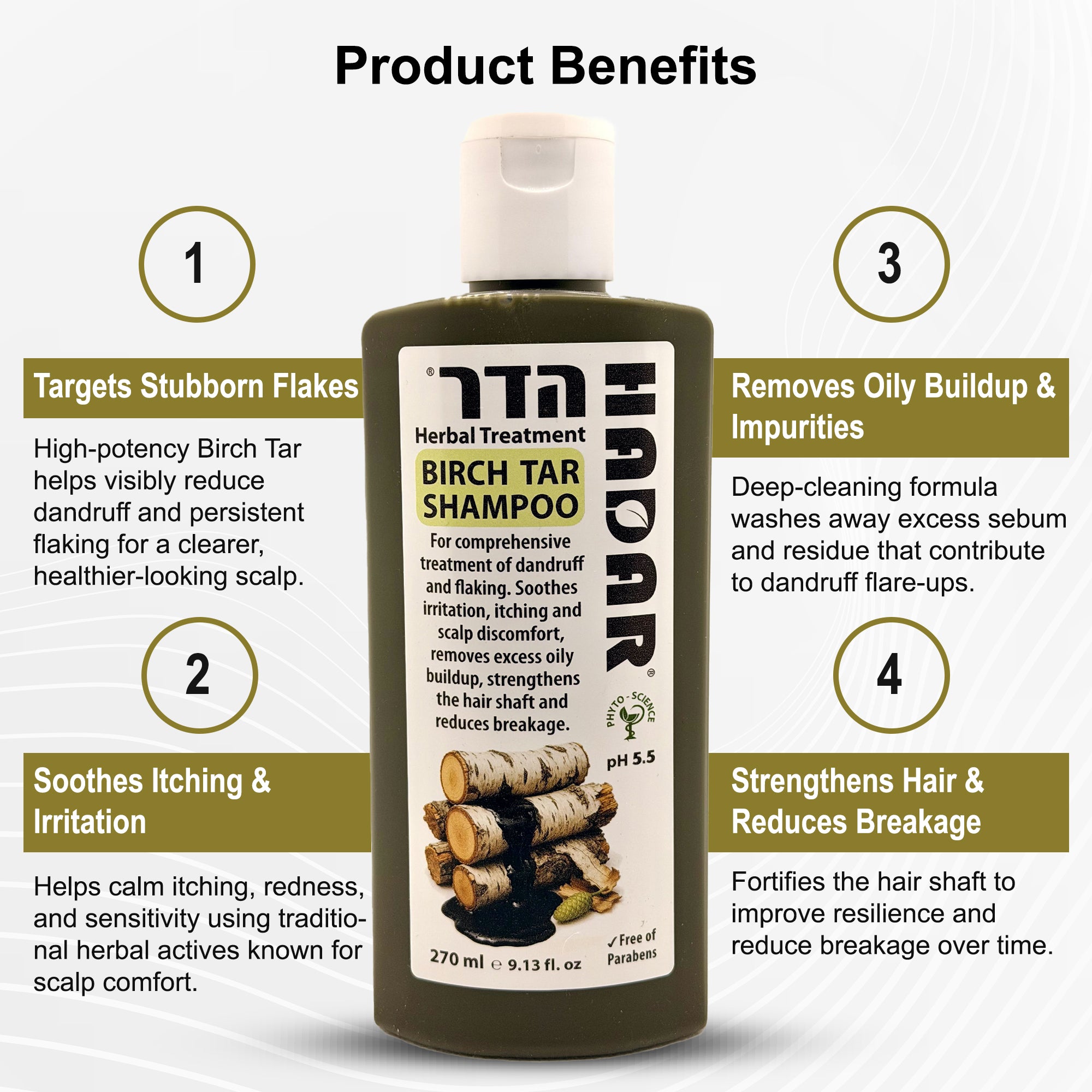 - Experience targeted, therapeutic care with HADAR Herbal Treatment Birch Tar Shampoo, a specialized formula designed for those who need more than just a basic dandruff shampoo. Harnessing a high concentration of premium Birch Tar, this powerful treatment helps address dandruff, persistent flaking, and scalp discomfort at the source. Birch Tar has long been used in traditional herbal care for its soothing, purifying, and scalp-balancing properties. This shampoo works to calm itching, reduce irritation, and diminish redness, offering noticeable relief even for sensitive or stressed scalps. Its deep-cleansing action helps remove excess oil, buildup, and impurities, supporting a cleaner scalp and helping prevent recurring issues. Beyond scalp health, HADAR’s formula strengthens the hair shaft to minimize breakage, improve resilience, and support fuller-looking hair. Gentle enough for regular use yet potent enough to address persistent concerns, this shampoo provides a comprehensive approach to scalp and hair wellness. If you’re looking for a shampoo that delivers true therapeutic performance with the power of concentrated Birch Tar, HADAR Herbal Treatment Birch Tar Shampoo is an effective addition to your hair-care routine.